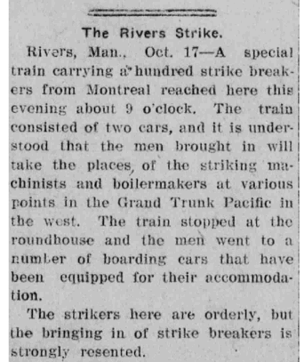 The Brandon Sun on Oct. 18 reported that 100 strike breakers from Montreal had reached Rivers and the the new workers would replace those out at various points. It notes that, “The strikers here are orderly, but the bringing in of strike breakers is strongly resented.” The report was an exaggeration as only about ten boilermakers and two machinists were sent to Rivers, but as one might expect there were a few incidents.