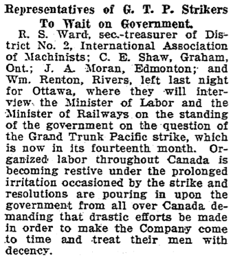 It took some time, and over a year had gone by before the end was in sightr. In December of 1912 representatives of the G.T.P. strikers, including William Renton from Rivers, met with the Minister of Labour in Ottawa about the strike, which had now lasted 14 months. It was settled shortly afterwards, with the strikers gaining most of their demands.