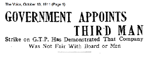The strike against the G.T.P. was declared on Oct. 10, 1911 by machinists and boilermakers who sought parity to CP. and CN workers. Objectives included a 9 hour day and a minimum of 45 ½ cents per hour.