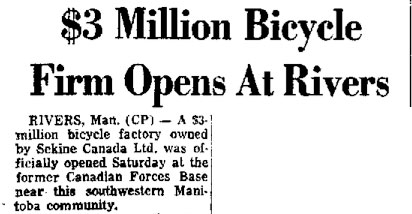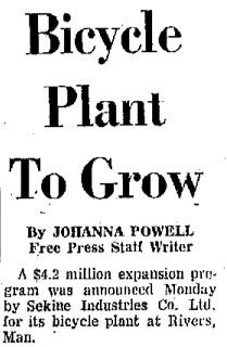Soon after the announcement of the deal there was an interesting wrinkle in the story. Osmond Mellon, who hoped to manufacture bicycles in Winnipeg, claimed that some proposed changes on bike safety regulations were designed to favour the Japanese company. It seem that Sekine was one of the few companies that could meet certain of the new regulations.