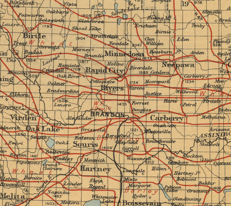 Canada Natural Resources Intelligence Branch. Southern Manitoba [map]. 1:1,584,000. In: Canada . Dept. of Immigration and Colonization. Canada West. Ottawa: Canada . Dept. of Immigration and Colonization, 1930. Shows Railways and Natural Resources. A. Manvel (General Manager, St. Paul, Minn.) W.S. Alexander (General Freight and Passenger Agent, St. Paul, Minn.) H.C. Davis, (Assistant General Passenger Agent, St. Paul, Minn.)