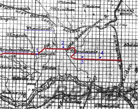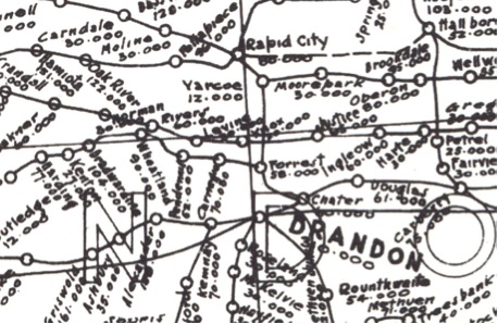 By 1902, the Great Northwest Central Railway had built a line from Forrest to Lenore. The new villages of Bradwardine (1), Wheatland (2) , Pendennis (3) and Carnegie (4) were established. All of these names except Carnegie were already on the map as Post Offices, but in each case the location was changed as the Post Office moved to the new railway settlement.