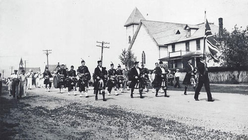 The Rivers and Brandon Pipe Band marching south on Main Street with the Rivers United Church in the background. Donald (Don) Mitchell and George Mitchell are the first 2 pipers in the front row. This is from the mid 1930's.